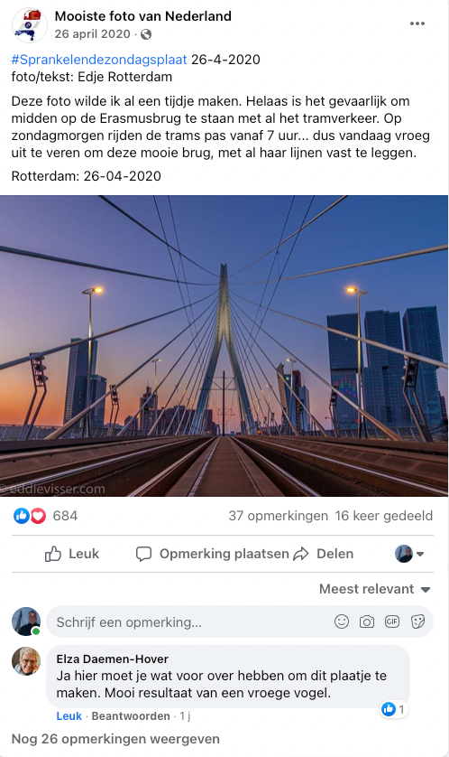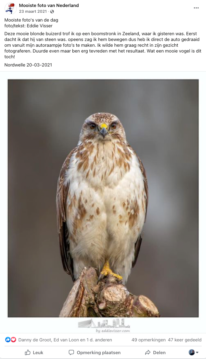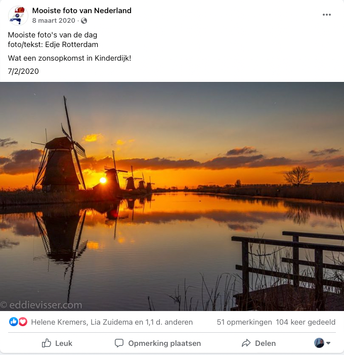 Hier zie je waar mijn foto's zijn gepubliceerd. Ik ben erg trots dat de eerste foto's zijn geselecteerd voor de National Geographic agenda 2022. De overige foto's zijn geselecteerd door de Facebook groep Mooiste foto van Nederland.